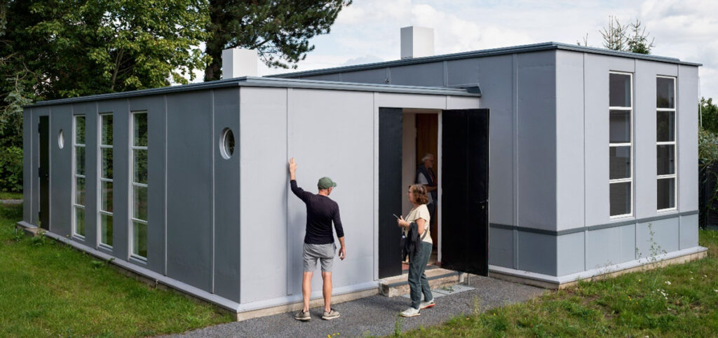 Weiter geht es zu Blech | Membran | Bullauge, der Präsentation am Stahlhausin der Siedlung Dessau-Törten. Hier geht es ganz um Metall, das in den Jahren nach dem Ersten Weltkrieg als Werkstoff der Zukunft angesehen wurde. Das Stahlhaus ist ein Experimentalbau, vorwiegend aus Blech, mit spannenden Raumlösungen – und mangelnder Dämmung und Rostschutz. Diese Art des Bauens also war eher ein Fehlschlag, aber zur Innovation gehört auch das Experiment, gehört auch der Mut, Fehler zu machen. Jetzt steht das Stahlhaus saniert da, im Ursprungszustand. Wüsste man es nicht besser, man würde glatt einziehen.